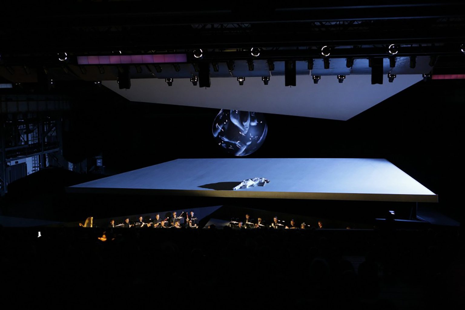 Heart piece of the staging was a hydraulic stage (25 meters wide and 8 meters deep), which was movable in 2 axis, front as well as sideways and the stage could tilt as well. The drives stood on dual 40 centimeters tyres. They were housed in a 1,5 x 1,5 meters footprint and about 1 meter high. Each of them weighing 970 kilograms. The whole stage construction was about 14 tons. On a flying system, a 2 meters sphere was fixed which was moved along the EHB track, which seemed to be a real moon in the production. One roll-screen was moved in the stage background – which seemed to be a horizon. Both were moved on the EHB tracking system.