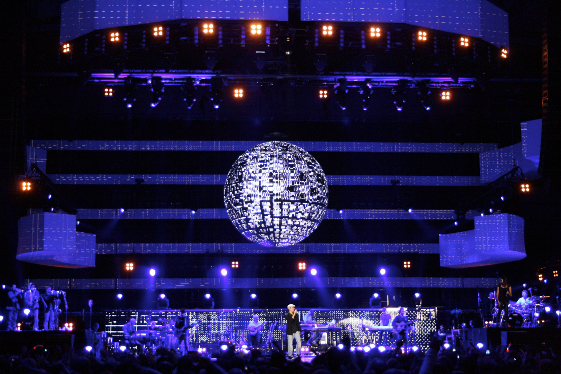 The center of the stage was a mediaglobe, which could turn 220 degrees around and function as a huge LED wall at the same time. The globe’s diameter was 4.5 meters. It consisted of a truss construction and a half-sided exterior shell of LED video modules. The other side of the globe was a mirror ball. Hanging on 3 chain hoists, it could be moved vertically. The whole construction had a total weight of more than 2 tons.
