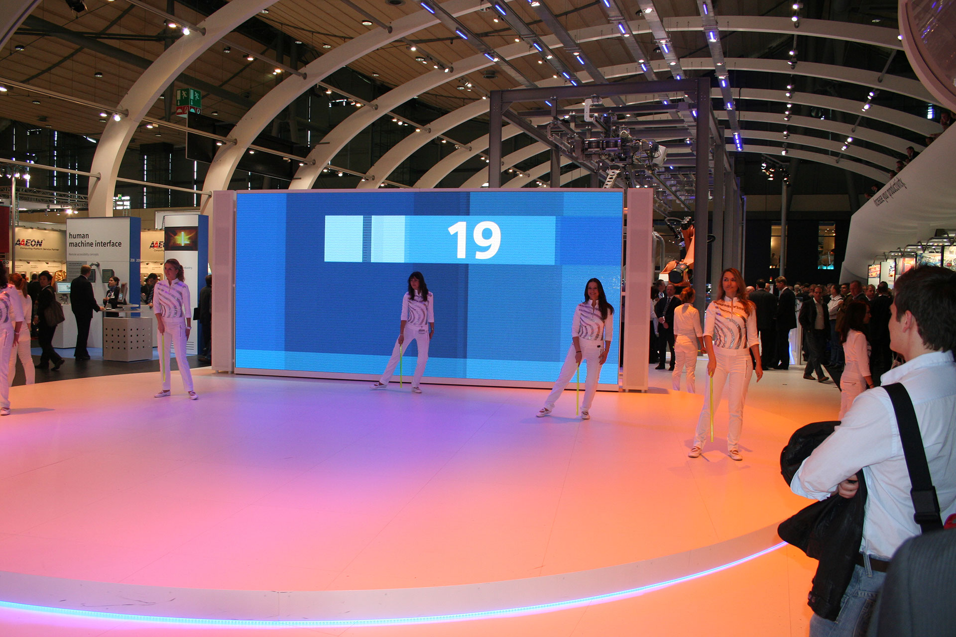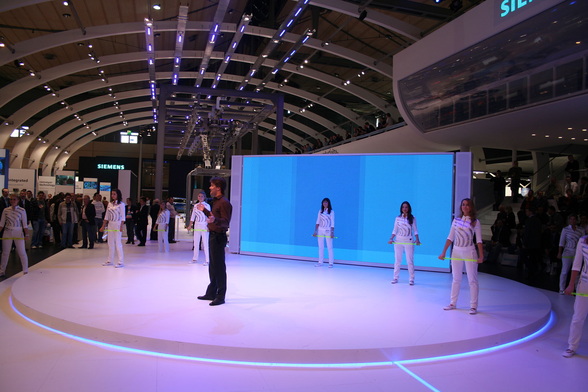 Nirgendwo sonst trifft man auf so viele wegweisende Technologien wie auf der Hannover Messe (HMI). Sie ist der führende Marktplatz für technische Trends und der ideale Ort, um sich modernstes Know-how zu sichern und neueste Entwicklungen zu präsentieren. Für eines der wichtigsten Technologieereignisse weltweit bestückte Stage Kinetik 2008 den Stand von Siemens mit einer 10 Meter Drehscheibe und einer LED-Wand.